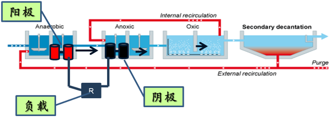 MFC同步的脫氮除碳—陽極利用微生物去除有機物產(chǎn)生電子,同時在陰極(生物陰極)利用硝酸鹽還原菌催化硝酸鹽還原,從而實現(xiàn)在去除有機物的同時,脫去污水中的氮。